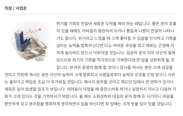 | 직장/사업운 | 승진운, 이직 가능성, 사업 확장 여부 등 실무적 조언 제공 |