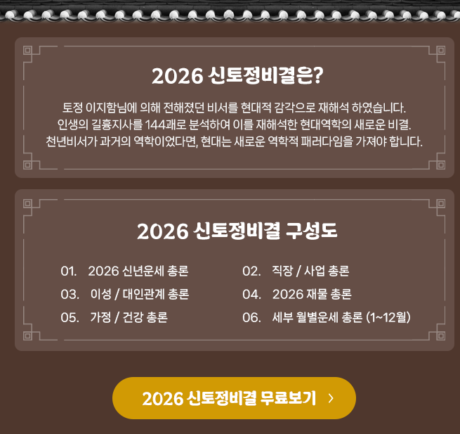 | 총운 | 2026년 전체 흐름과 방향성을 분석해 한 해의 큰 틀을 보여줌 |